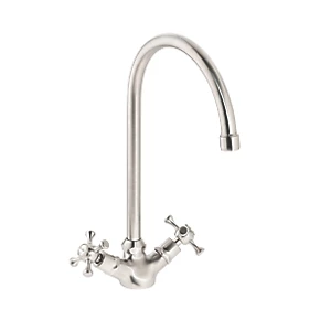 ¼ turn operation with easy to use cross handles, built-in aerator and swivel spout. Traditional design with a brushed nickel finish.
