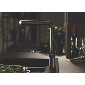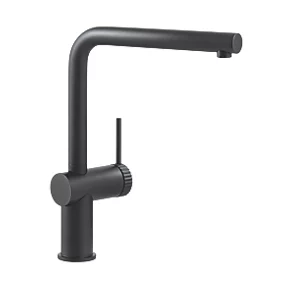 Contemporary design with a 90° angled swivel spout. Includes a cold start valve that prevents unnecessary hot water usage. Matt black finish.