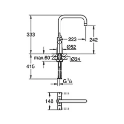 Dual-handle set up with ceramic quarter turn valves. Quad spout registers lower in height than typical swan spouts, so it can be more suitable when specified under shelving or wall cabinets.