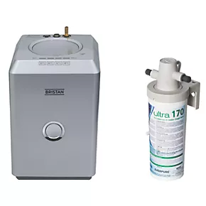 Multifunction tap dispenses cold and hot water. Features safety touch and hold sensor for hot water up to 98°C after a few seconds. Separate touch sensor controls for filtered water. Includes 5 stage filter cartridge which absorbs chemicals, reduces water hardness and prolongs the life of the tank.