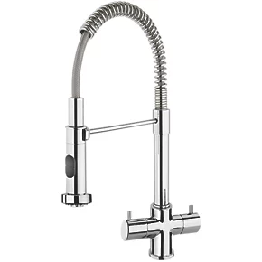 Modern pull-out nozzle tap with spout connected to a hose enabling water to be directed to wherever it is needed. Switch between standard flow and spray at the push of a button for extra versatility. Supplied with perlator for champagne-like water flow. Dual-lever control.