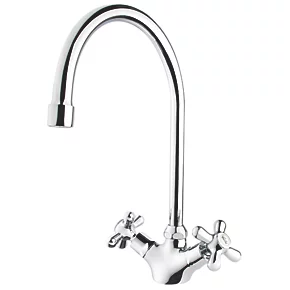 Traditional design with swan neck spout. Chrome finish.